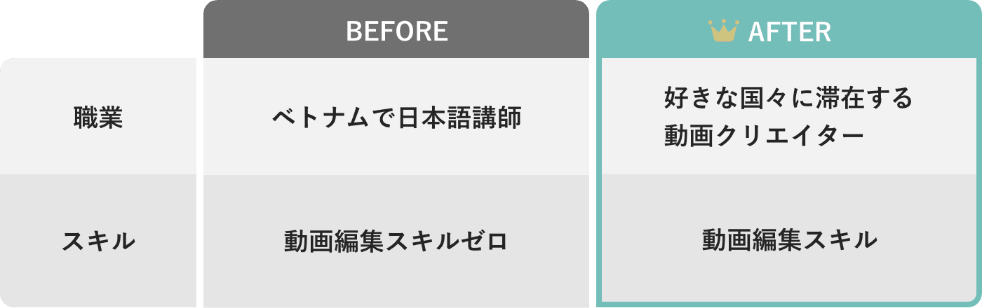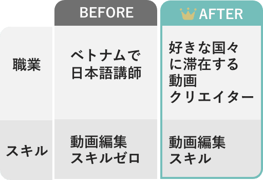 しかし、「動画編集で稼ぐ正しい方法」に気づいてからは、収入が増え月収100万円を達成。今では累計200名以上の動画編集者を直接指導して、副業やフリーランスでの収益化に成功。「動画編集の学習で失敗する人を1人でも減らしたい」という想いで、無料セミナーや動画編集スクールを運営中。